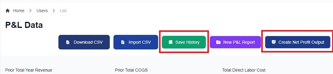 On the top-right of the screen click “Save History” to save the P&L and Product Data and then click “Create Net Profit Output”.