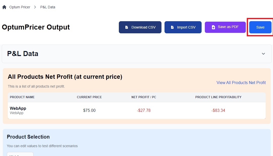 After clicking the “Create Net Profit Output” button you are taking to the “OptumPricer Output” screen which shows your entered “P&L Data” and below that, the “All Products Net Profit” section showing the inputted products’ Net Profit at their current price. This list lets the user see if any of the products' net profits are unsatisfactory. They can then perform what-if scenarios to improve the product’s net profit by modifying the product’s price, cost of material, labor or set-up time, etc. After making these what-if scenario modifications, in the “Product Selection”, the user can save them by modifying the “File name” and “Comments” and then clicking the “Save” button at the top of the screen.