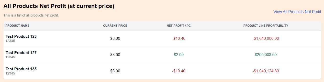 Net Profit Evaluation: OptumPricer generates table output displaying the net profit of each product at its current price. ABC Manufacturing Inc. identifies Test Product 123 and Test Product 135 as being below the price for profitability.